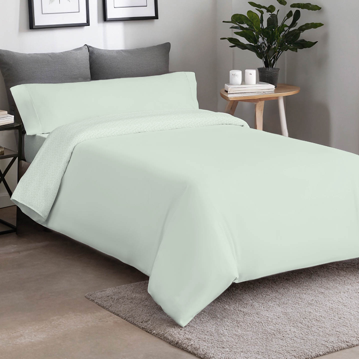 Duvet reversible en mezcla de 50% algodón y 50% poliéster, con estampado de hojitas y reverso liso. Combina suavidad, resistencia y fácil planchado, aportando frescura y estilo natural al dormitorio.