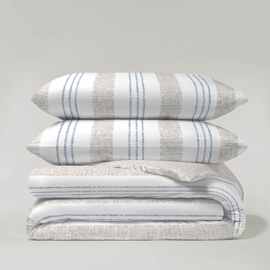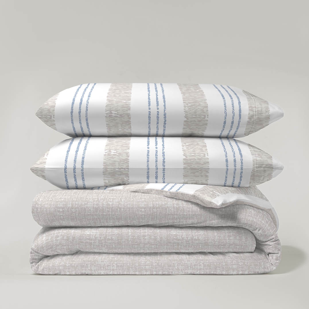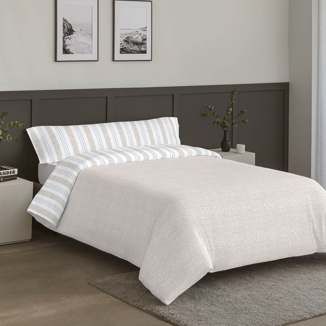 La funda nórdica Aneika está confeccionada en una mezcla de 50% poliéster y 50% algodón, lo que garantiza suavidad, transpirabilidad y fácil cuidado. Su diseño reversible te ofrece dos estilos en una sola prenda: por un lado, un elegante estampado de raya y por el otro, un diseño liso que aporta calma y sencillez a tu dormitorio.