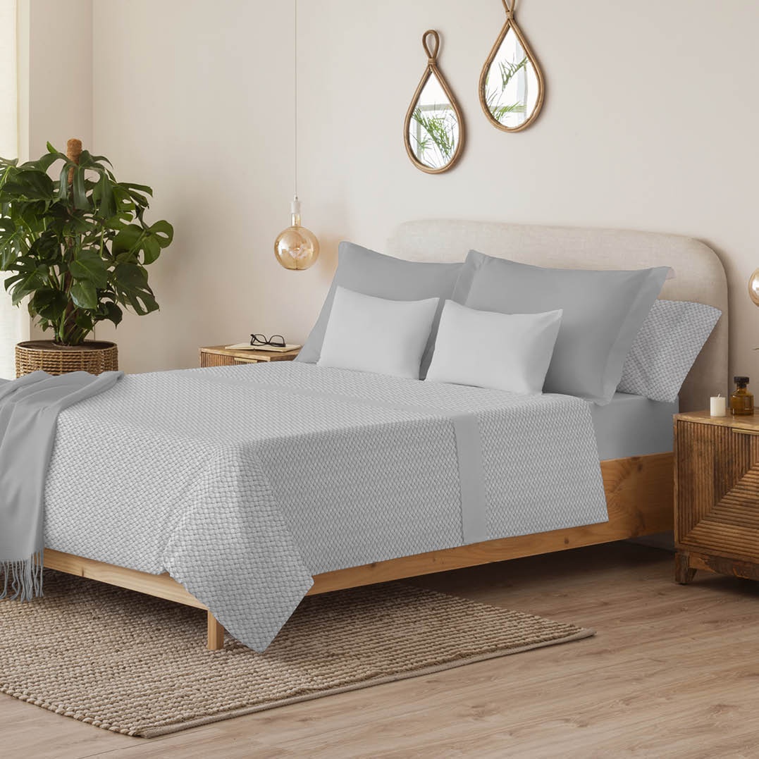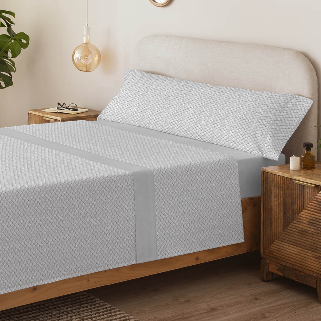 Aporta calidez y suavidad a tus noches con este juego de sábanas de microlina, un tejido que combina ligereza, confort y abrigo. Su diseño con un delicado dibujo geométrico crea un estilo elegante y atemporal que viste la cama con distinción.