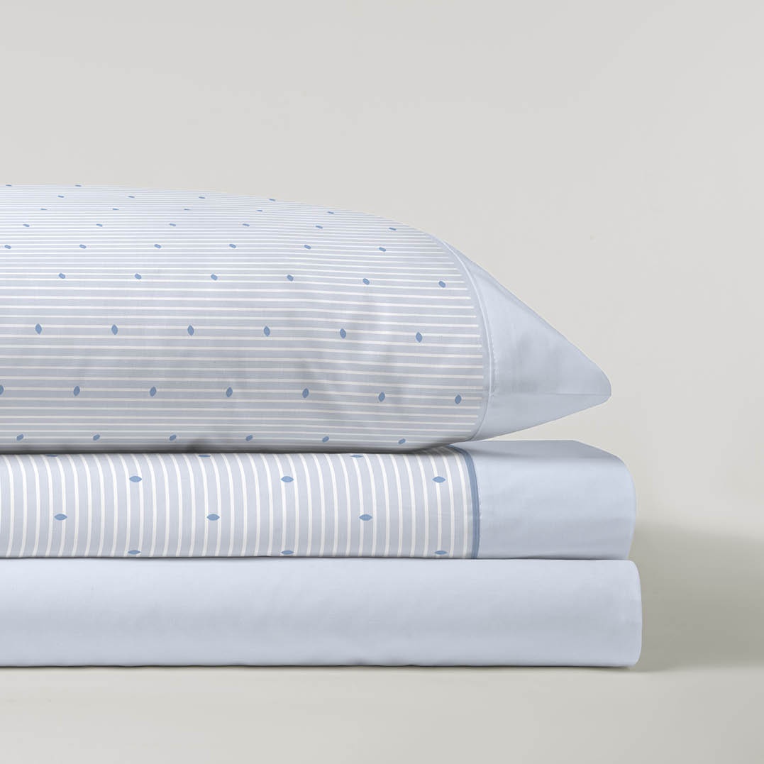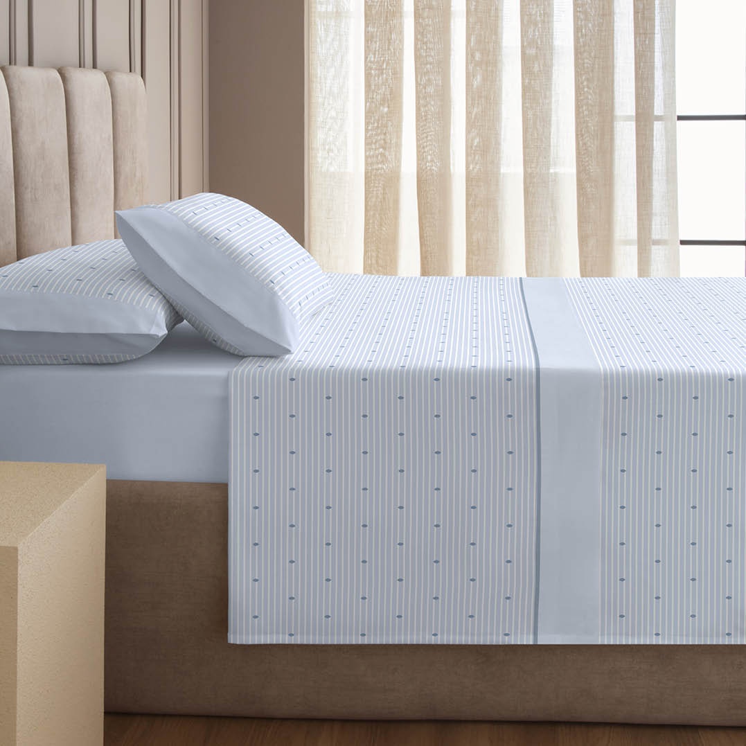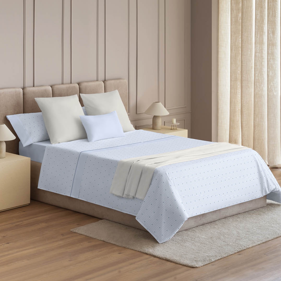 Un diseño delicado y actual que combina pequeñas figuras geométricas sobre un fondo claro con finas líneas horizontales, aportando frescura y armonía al dormitorio. La franela, cálida y suave al tacto, lo convierte en el juego ideal para las noches frías de invierno.