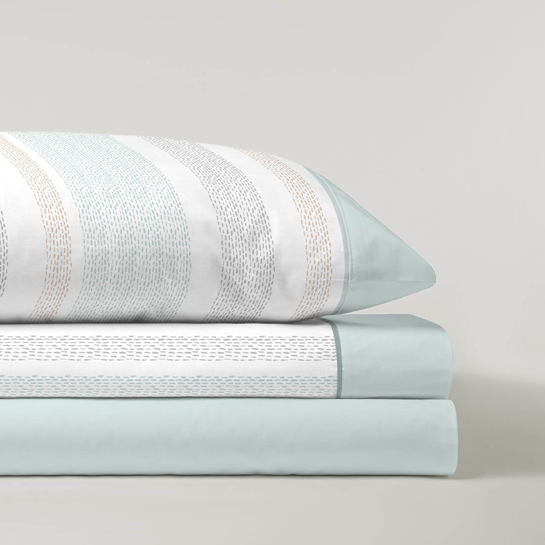 Un diseño moderno y alegre con franjas horizontales en tonos suaves, formadas por pequeños trazos que aportan dinamismo y frescura al dormitorio. Ideal para quienes buscan un estilo actual sin renunciar a la calidez.