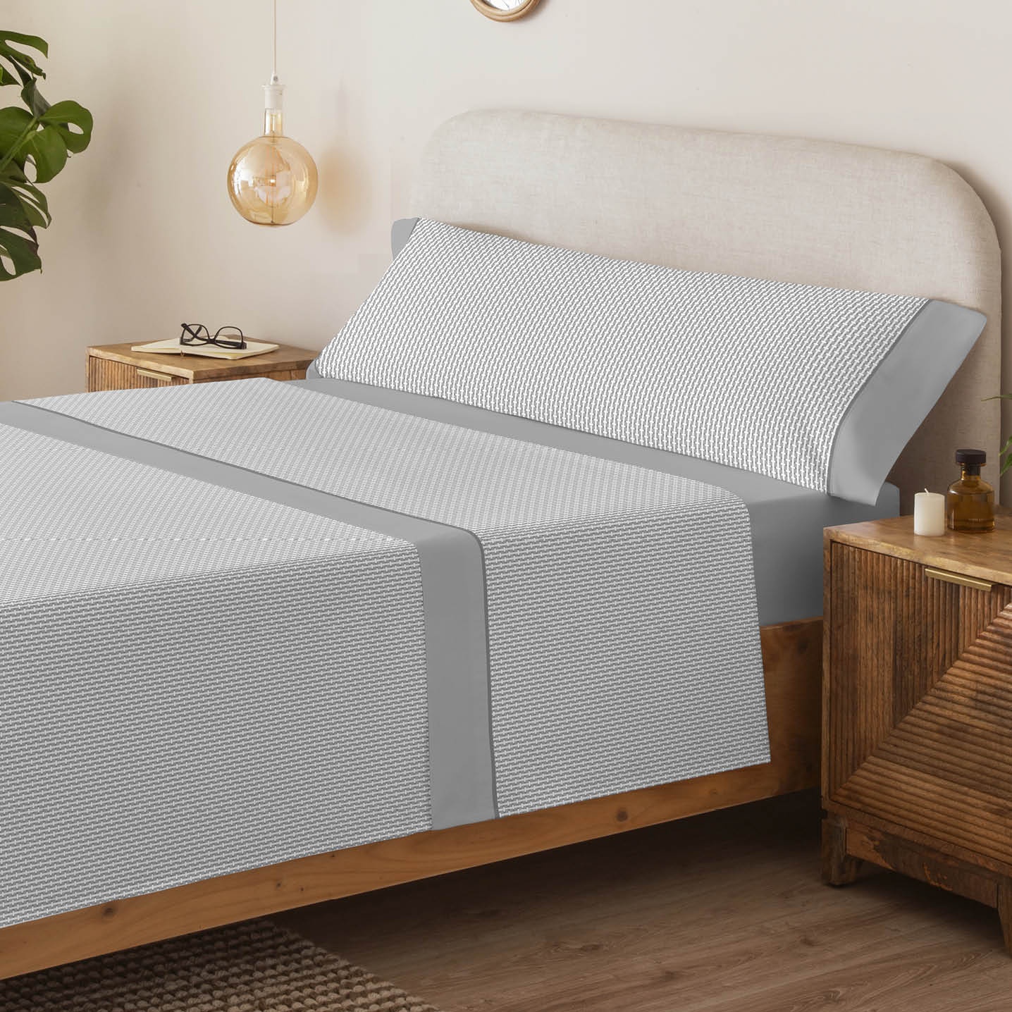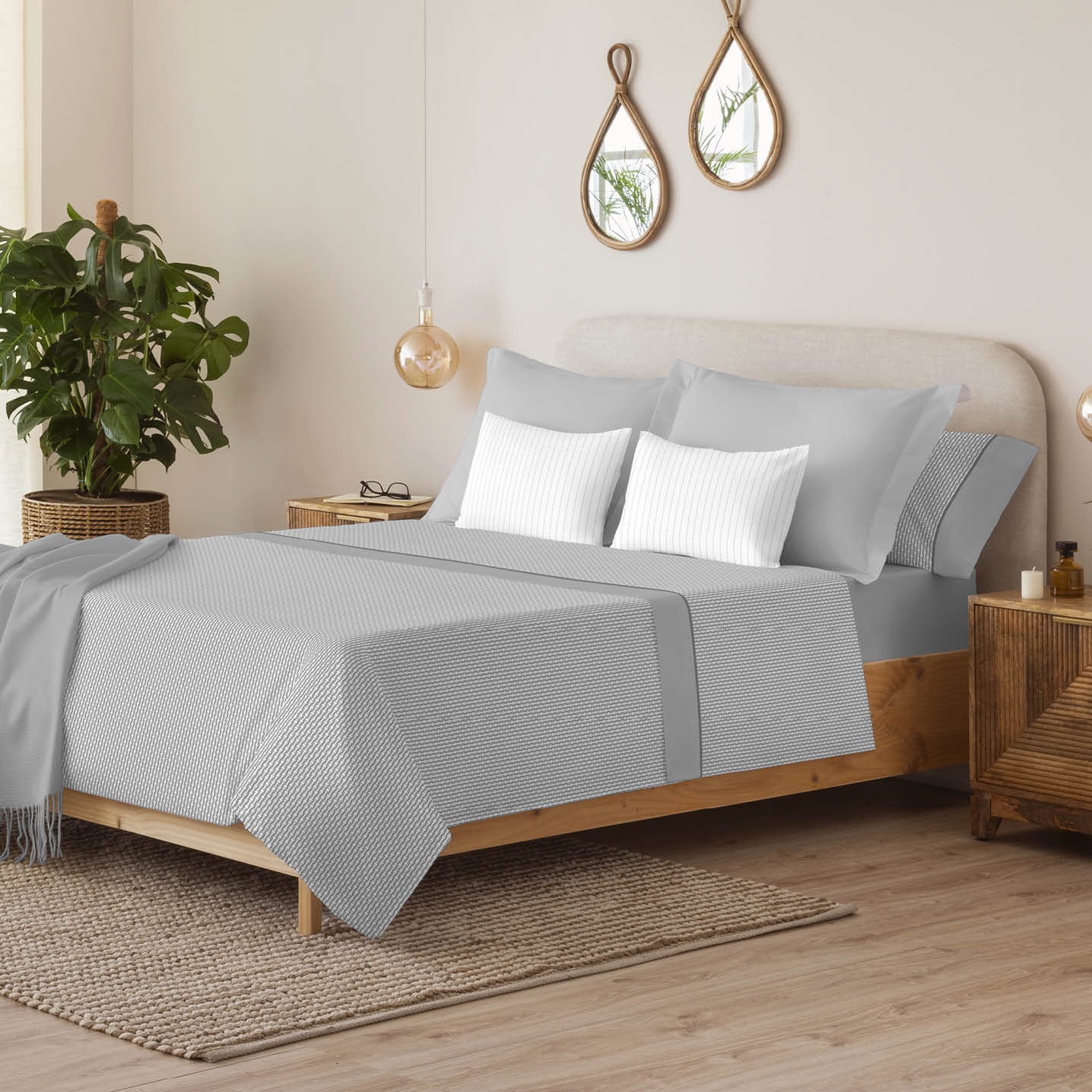 El modelo IKER presenta un elegante diseño geométrico de pequeñas formas entrelazadas que crean un efecto visual moderno y equilibrado. Su estilo minimalista en tonos lo convierte en una opción versátil y atemporal, perfecta para quienes buscan aportar sofisticación y calma al dormitorio.