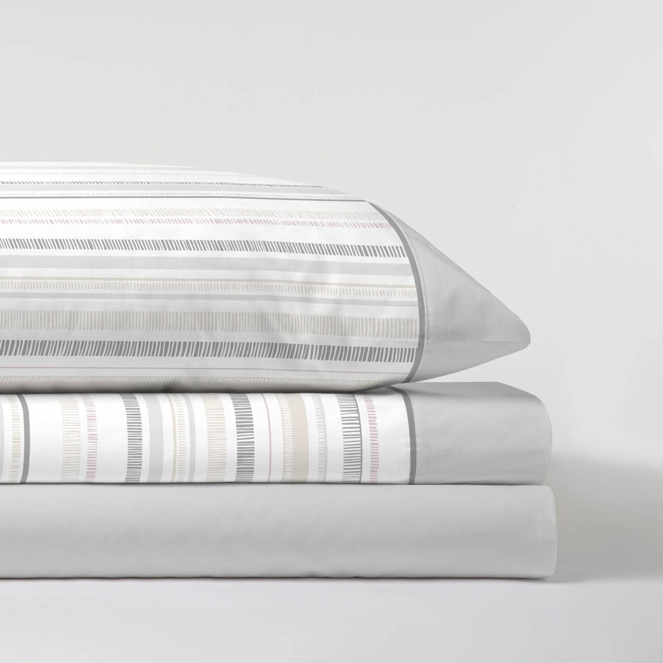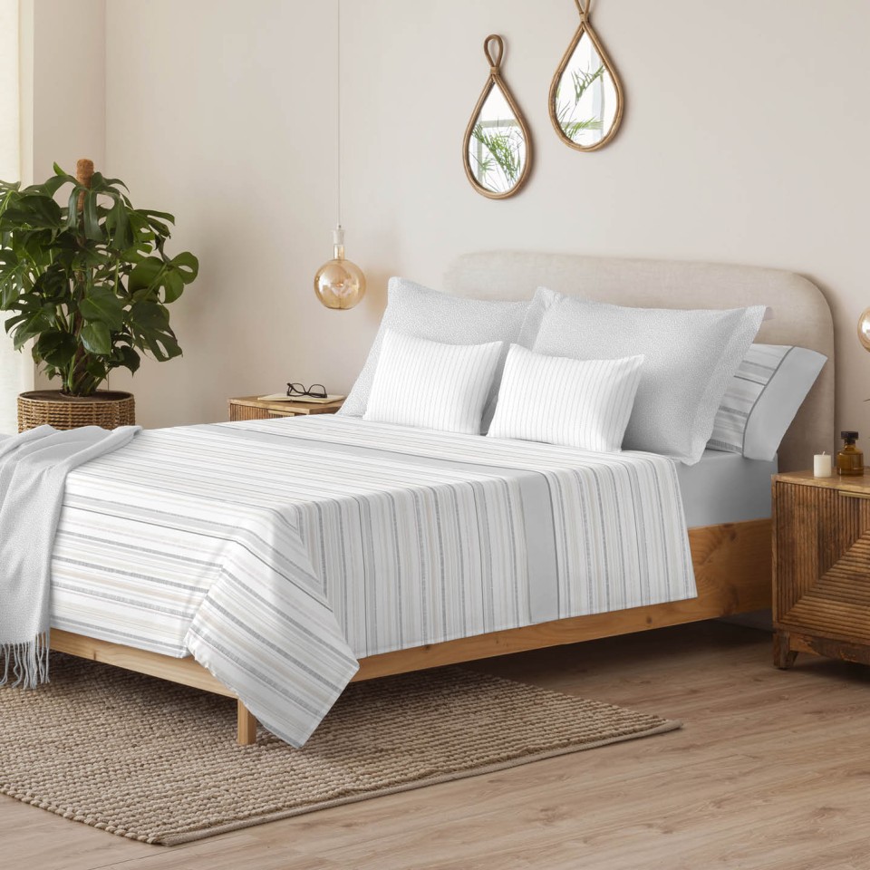 El modelo Alaric combina lo mejor de dos mundos: la frescura del algodón y la resistencia del poliéster, logrando una sábana práctica, cómoda y de fácil cuidado. Su diseño de rayas horizontales en tonos suaves transmite armonía y estilo, mientras que la confección con bies aplicado aporta un acabado elegante y de calidad superior.