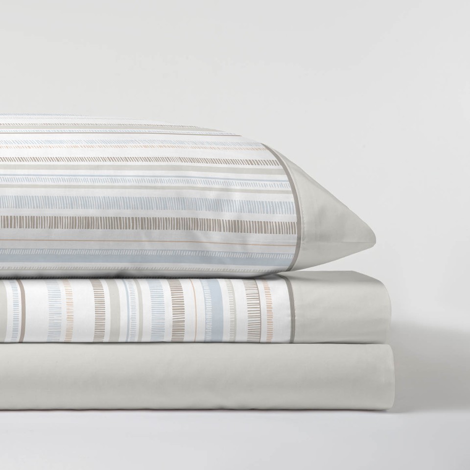El modelo Alaric combina lo mejor de dos mundos: la frescura del algodón y la resistencia del poliéster, logrando una sábana práctica, cómoda y de fácil cuidado. Su diseño de rayas horizontales en tonos suaves transmite armonía y estilo, mientras que la confección con bies aplicado aporta un acabado elegante y de calidad superior.