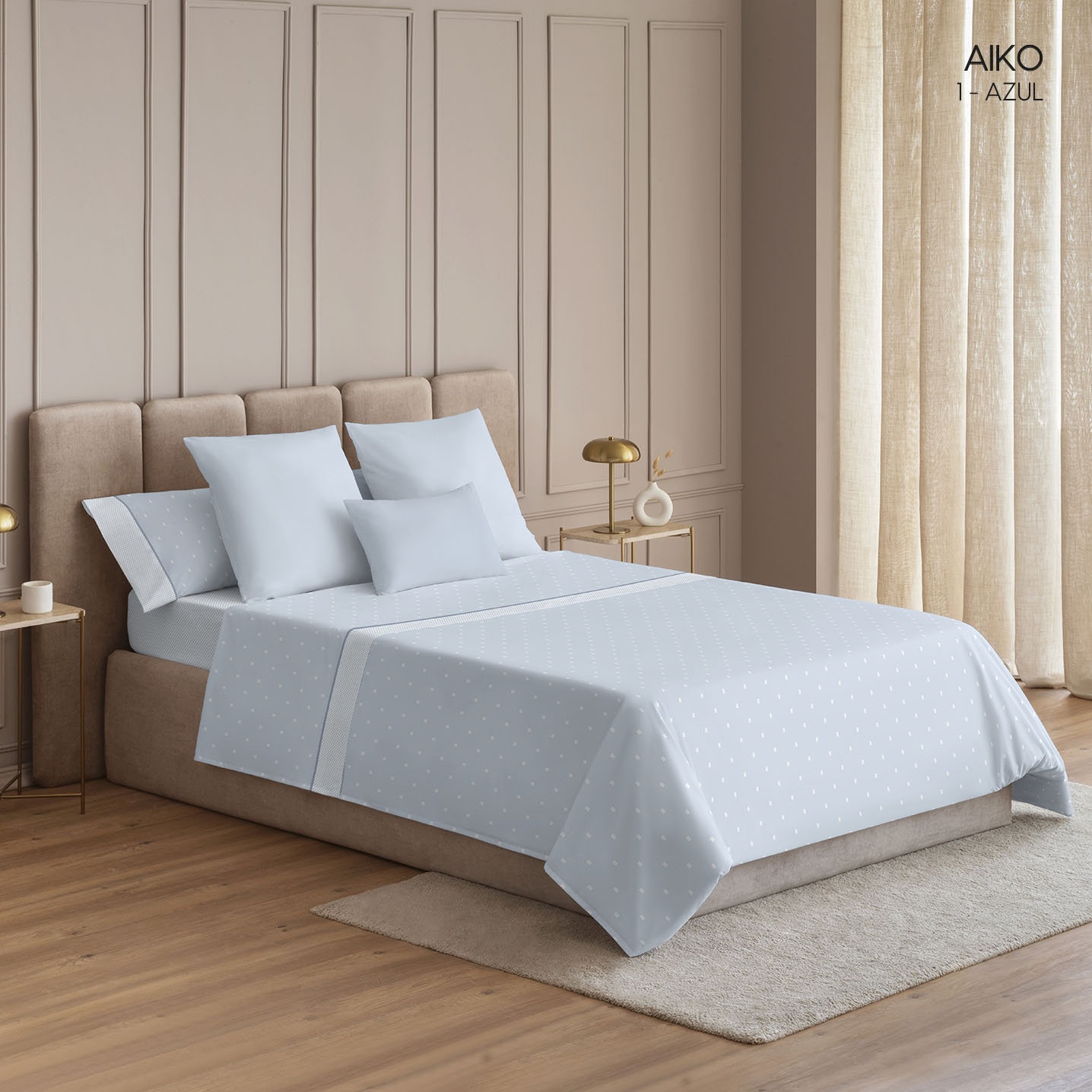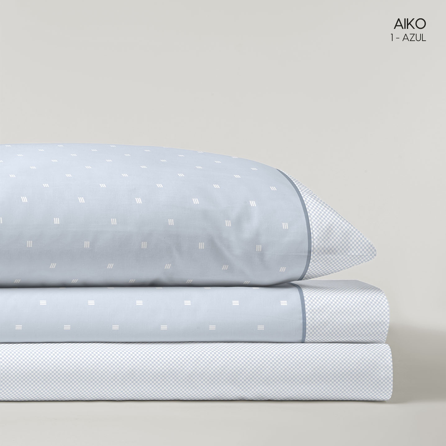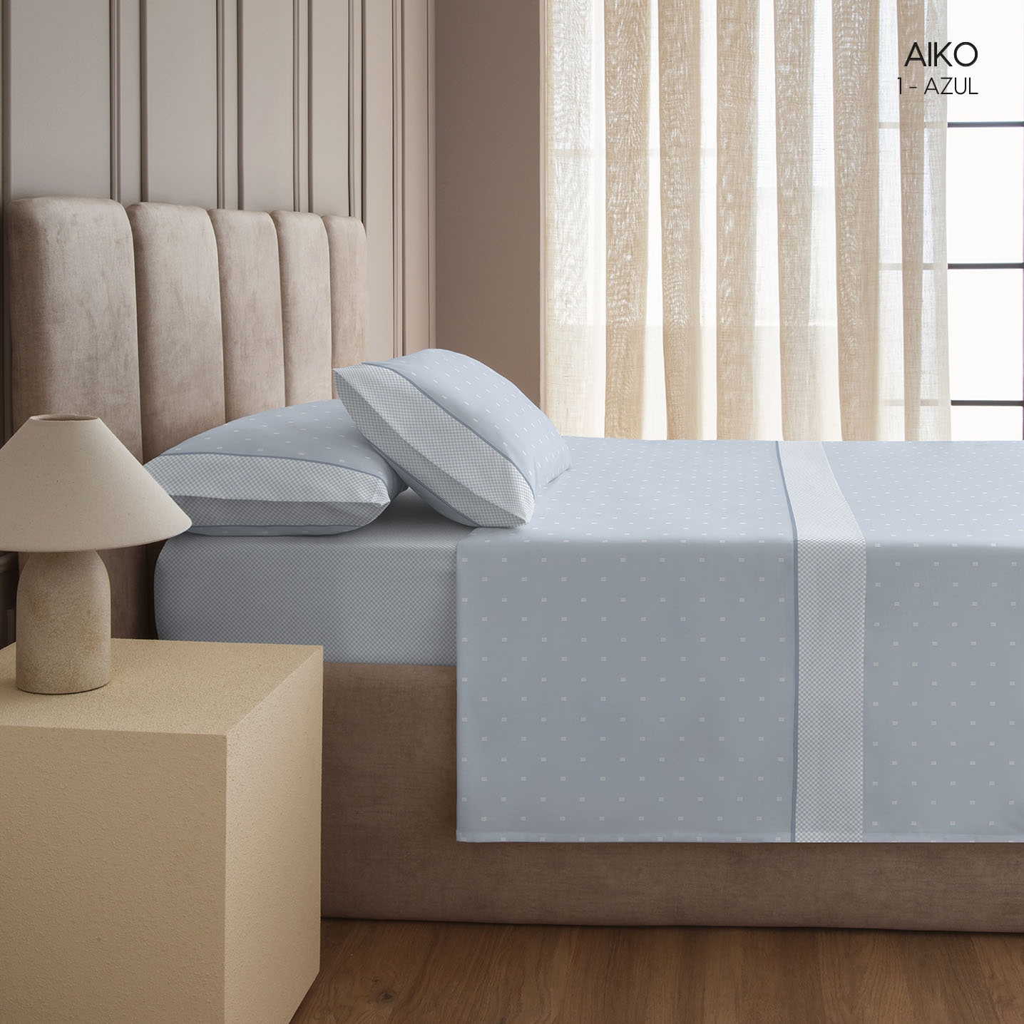 El diseño Aiko combina sencillez y frescura con un estampado geométrico de pequeñas líneas en blanco sobre un fondo liso. Su estilo limpio y minimalista aporta luminosidad y serenidad al dormitorio, convirtiéndolo en un espacio acogedor y elegante. Confeccionado en una mezcla de 50% poliéster y 50% algodón, este juego de sábanas ofrece la suavidad y transpirabilidad del algodón junto con la resistencia y fácil cuidado del poliéster. Su tejido de 180 hilos garantiza mayor suavidad y durabilidad. Además, la sábana bajera con alto de 30 cm asegura un ajuste perfecto incluso en colchones más altos, brindando comodidad en cada uso.