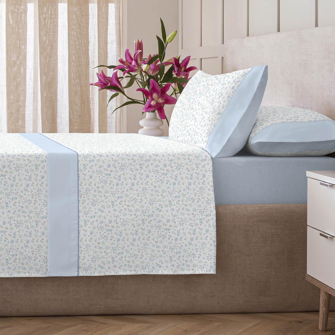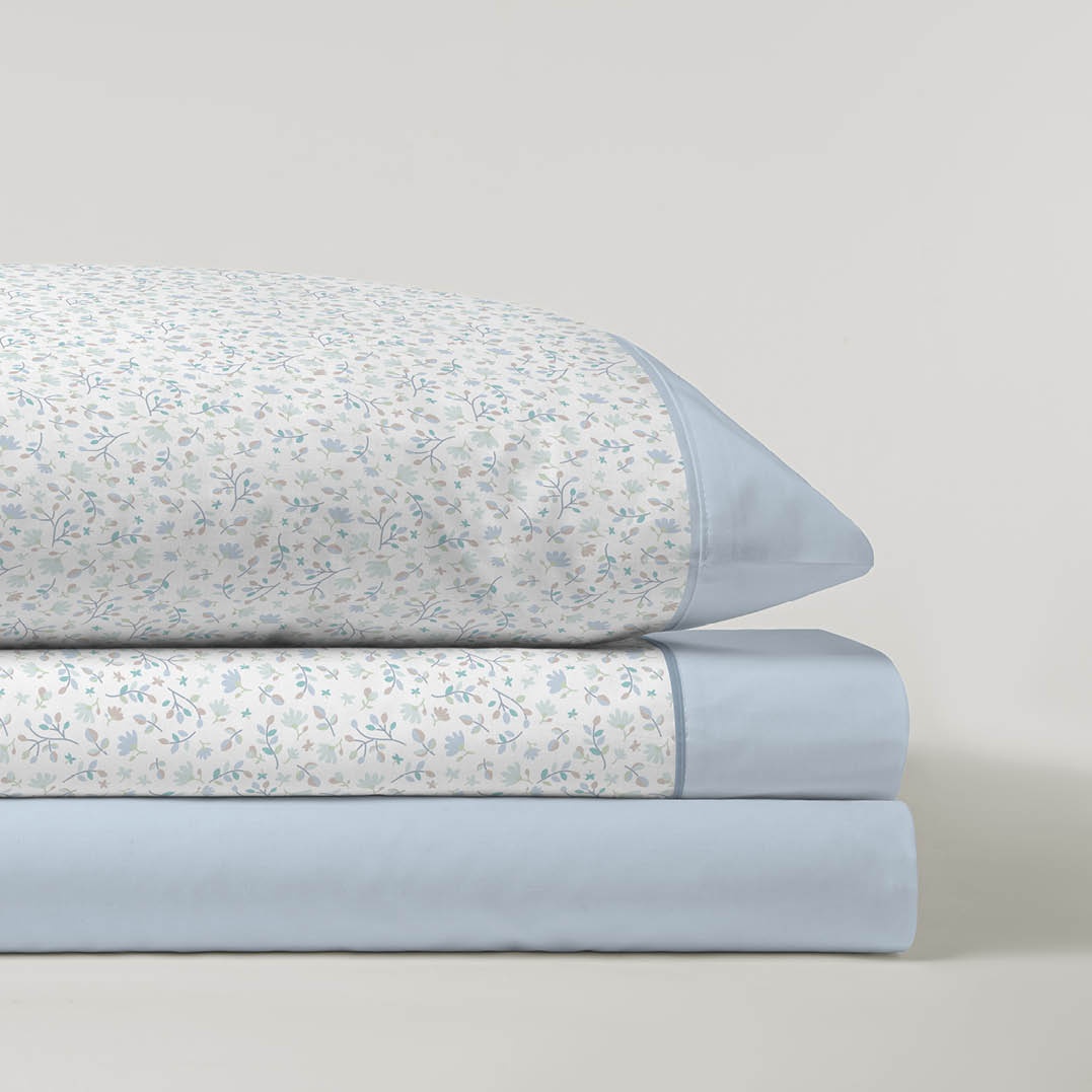 Aporta frescura y elegancia a tu dormitorio con este diseño de pequeñas flores en tonos pastel sobre fondo blanco, combinado con un detalle liso en color menta. Su estilo delicado lo convierte en una opción ideal para crear ambientes suaves y acogedores.
