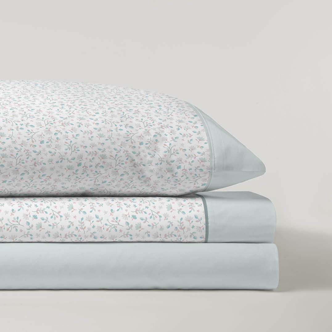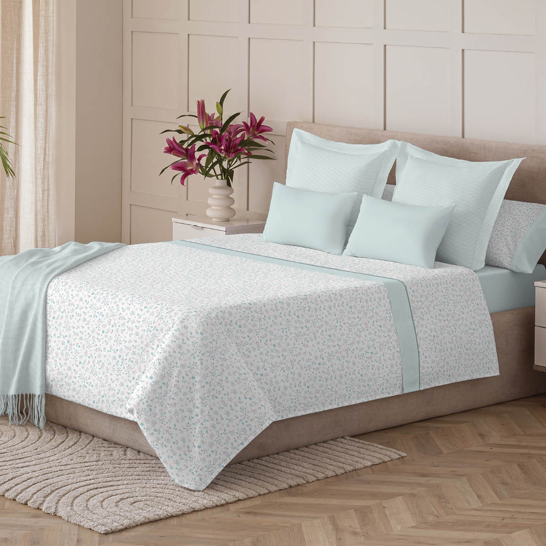Aporta frescura y elegancia a tu dormitorio con este diseño de pequeñas flores en tonos pastel sobre fondo blanco, combinado con un detalle liso en color menta. Su estilo delicado lo convierte en una opción ideal para crear ambientes suaves y acogedores.