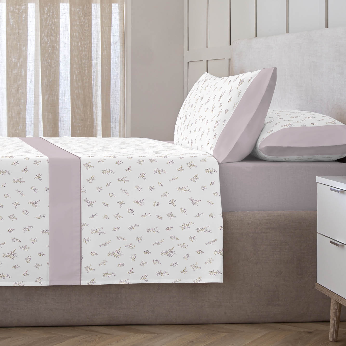 El modelo Alison destaca por su delicado estampado de ramitas y pequeñas flores en tonos suaves y cálidos sobre fondo blanco. Una propuesta romántica y fresca que transmite naturalidad y armonía, perfecta para aportar un aire acogedor y primaveral al dormitorio.