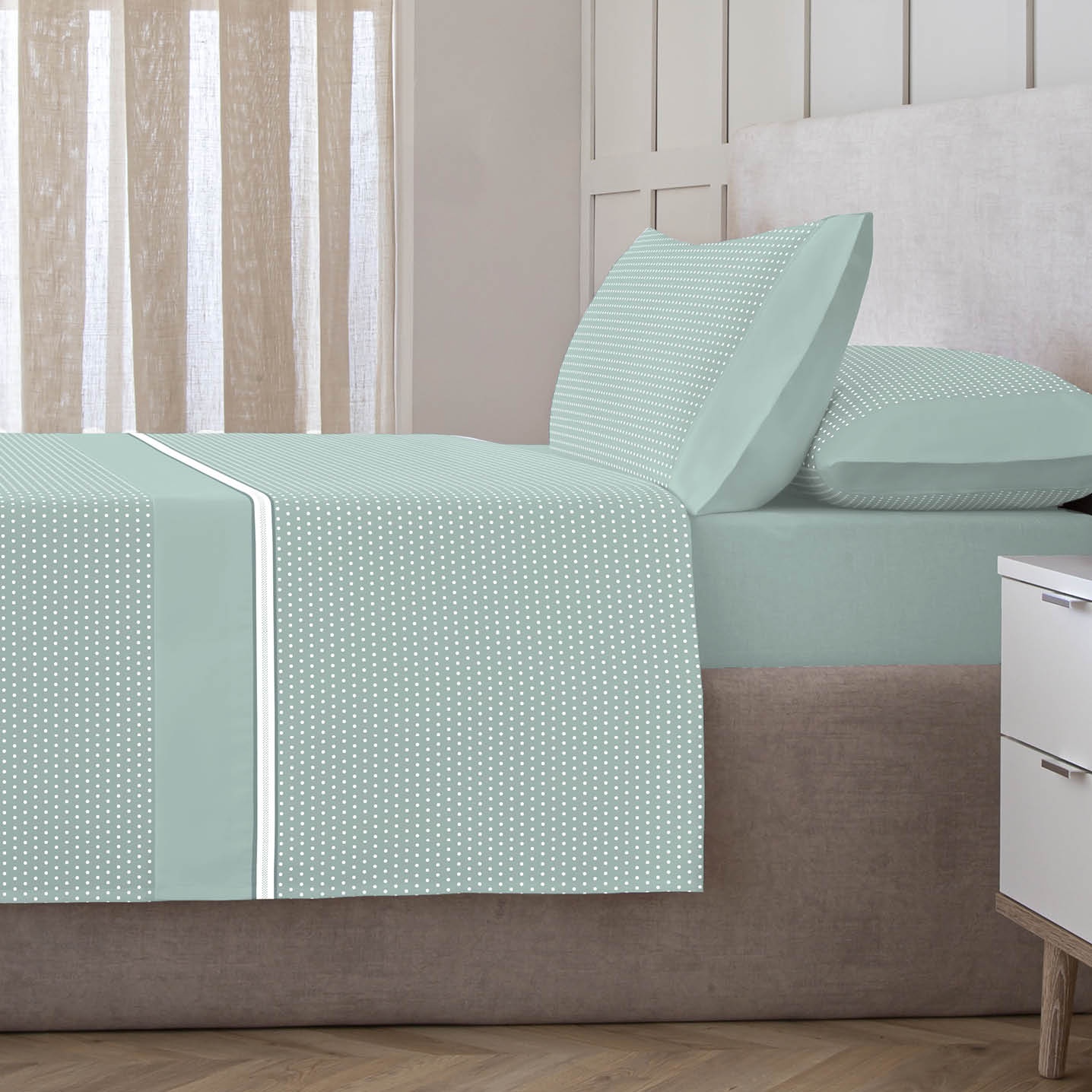 La sábana Otto combina la suavidad natural del algodón con la resistencia y facilidad de cuidado del poliéster, ofreciendo un descanso cómodo y duradero. Su diseño estampado de motivos geométricos y topos suaves aporta un estilo atemporal y sofisticado.