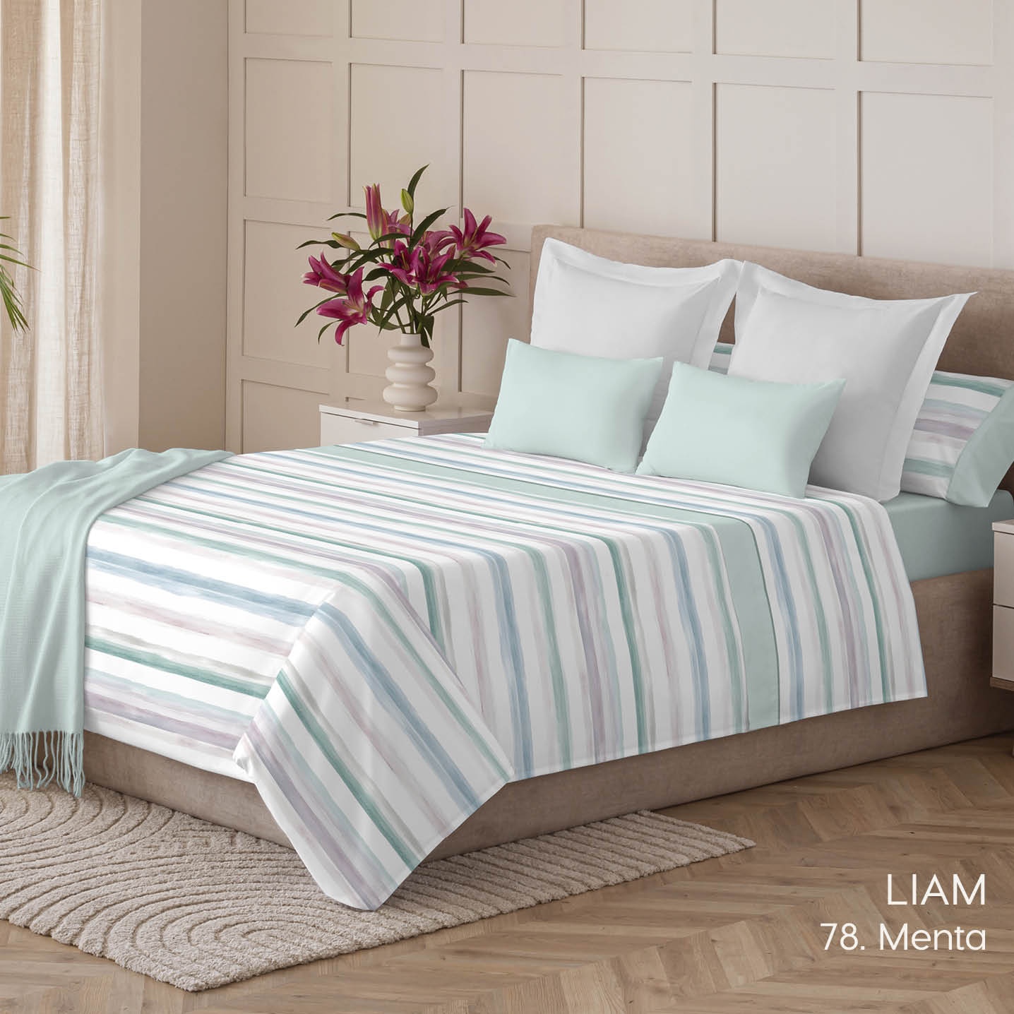 Dale un toque moderno y único a tu dormitorio con el juego de sábanas Liam. Confeccionado en 50% algodón y 50% poliéster.