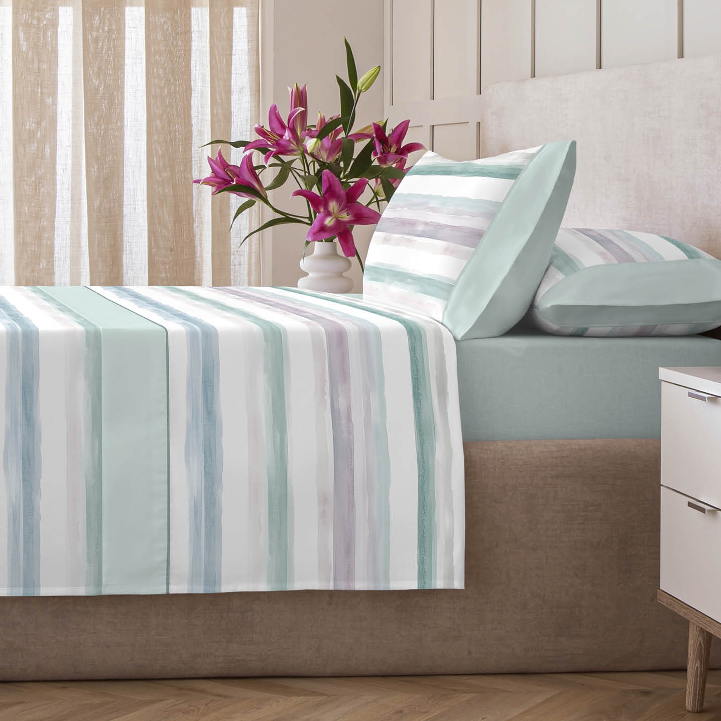 Su estampado exclusivo de líneas estilo acuarela ofrece una combinación de colores única, diferente a todos nuestros diseños, que aporta dinamismo y sofisticación a cualquier ambiente.