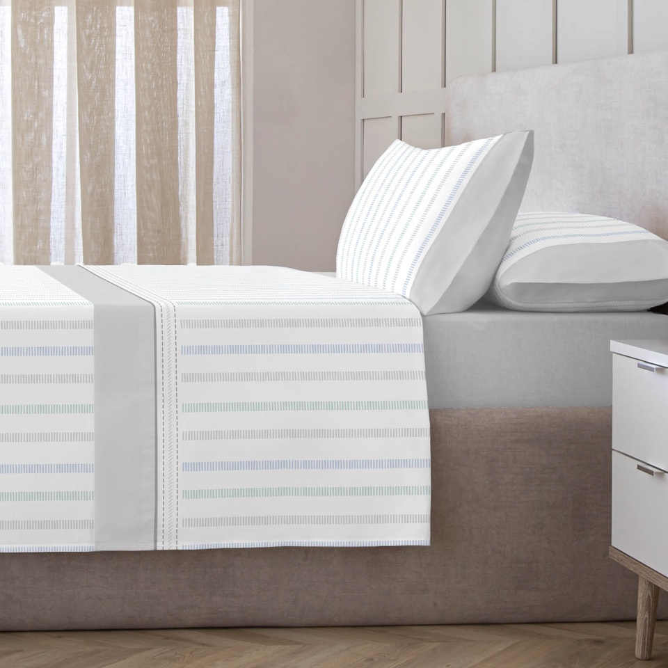 Transforma tu dormitorio con el juego de sábanas Roma, ideal para quienes buscan estilo y personalidad en cada detalle. Confeccionado en 50% algodón y 50% poliéster, asegurando un descanso fresco, cómodo y duradero. El estampado de líneas modernas aporta un toque juvenil y alegre a tu habitación, creando un ambiente dinámico y lleno de energía.